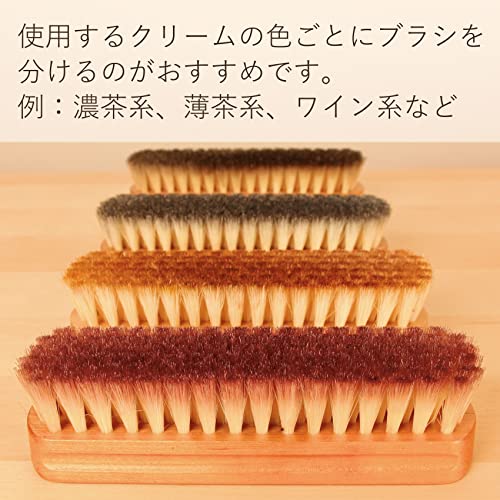 クリームを塗った後に、豚毛ブラシでブラッシングすることで、クリームを革にしっかりと馴染ませ、艶やかに仕上げます。色付きクリームを使用する場合には、クリームの色ごとに異なるブラシを使い分けると良いでしょう。